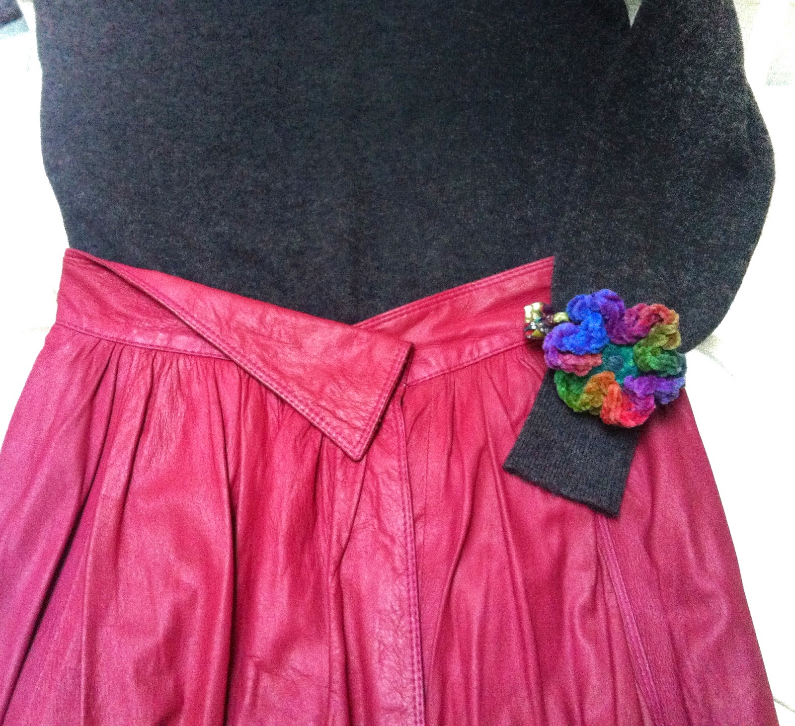 Bevor der Winter vorbei ist (bleibt aber momentan wohl ein frommer Wunsch..) wollte ich nochmals diesen weiten 1970er Rock aus weichem Leder in der Farbe des Moments, MARSALA, anziehen. Voriges Jahr hat's noch WEINROT geheissen und war nur was für alte Damen, auch deswegen, weil die Farbe als schwierig galt, erlaubt war nur cremefarben und grau. In Wirklichkeit aber passen viele Farben und Muster dazu, und je heller, desto jünger wird der Look